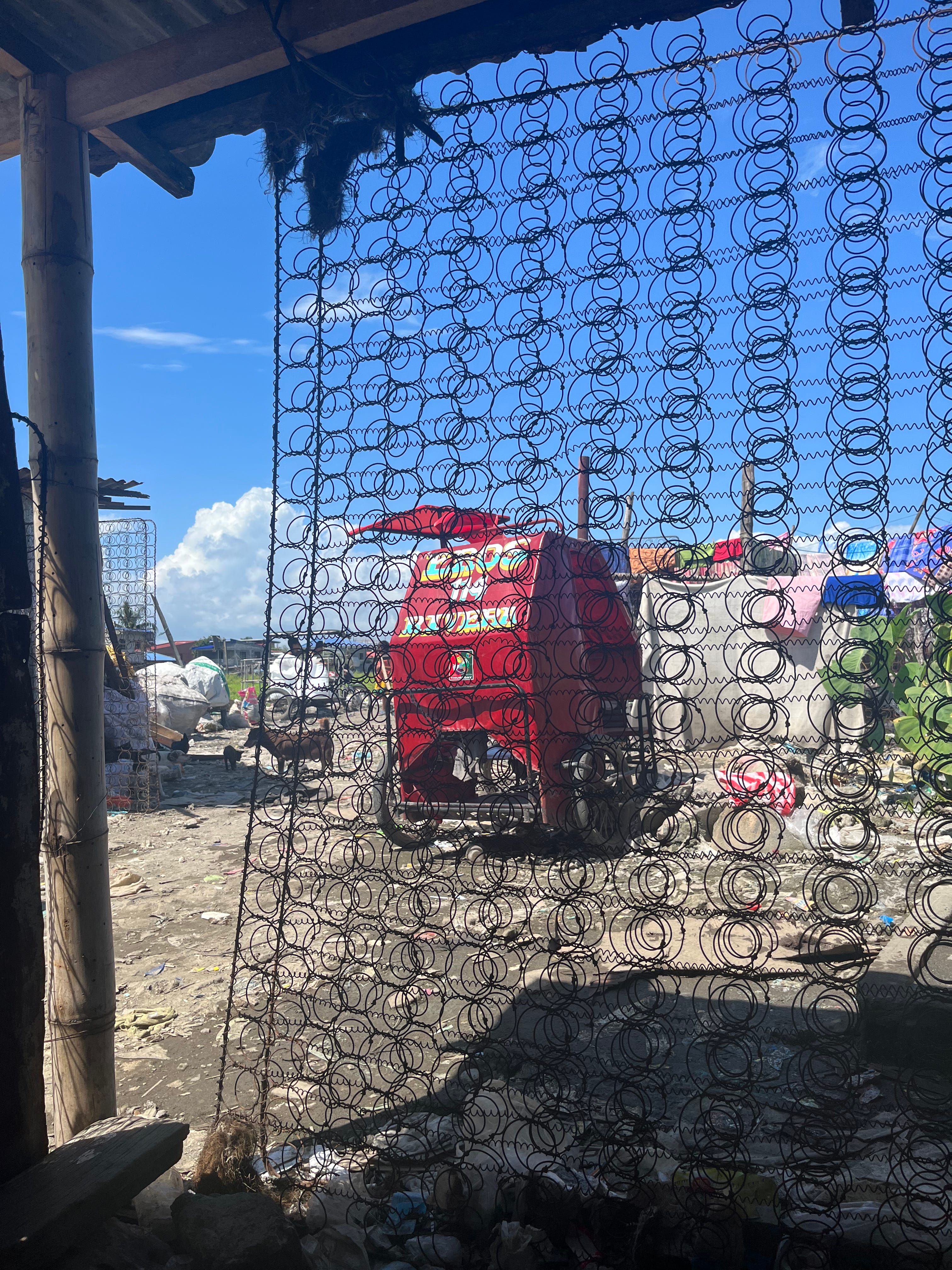 As we trailed through the area, we entered a narrower path hugged by walls of wood, scrap metal, and flowery shrubs. To our left, we were ushered into a kubo with a roof of patched corrugated metal and walls of old bed springs. This was a detail that stuck with me long after the weekend. What used to be a bed now was a wall that one could see through.
